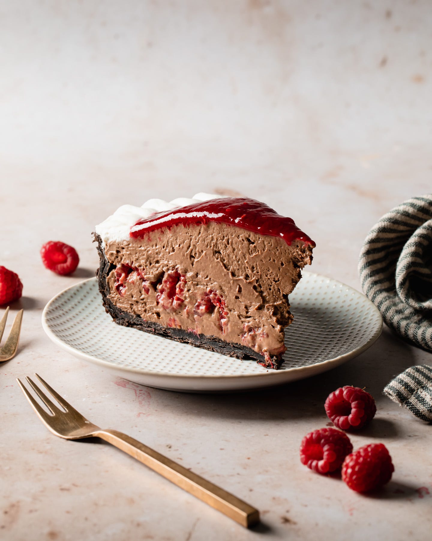 But that chocolate mousse? So creamy and so decadent! It is lightened with whipped cream, and the added cream cheese gives it a pleasant tangy and cloud-like texture to offset the rich chocolate. I was nervous about adding the raspberry coulis on top of an already picture-perfect pie, but it was the perfect touch. The thick glaze spread effortlessly over the mound of mousse, and it added the perfect amount of tartness to brighten up the whole pie. I think I’m in love!