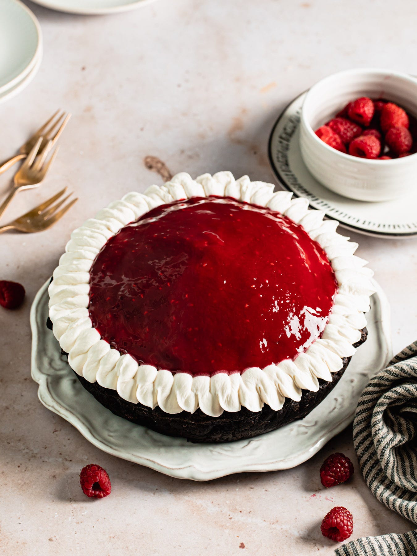 When ready to serve, pipe whipped cream around the edges of the pie (I used a #104 petal tip). Spoon the raspberry coulis on top and gently spread over the chocolate mixture with an offset spatula.